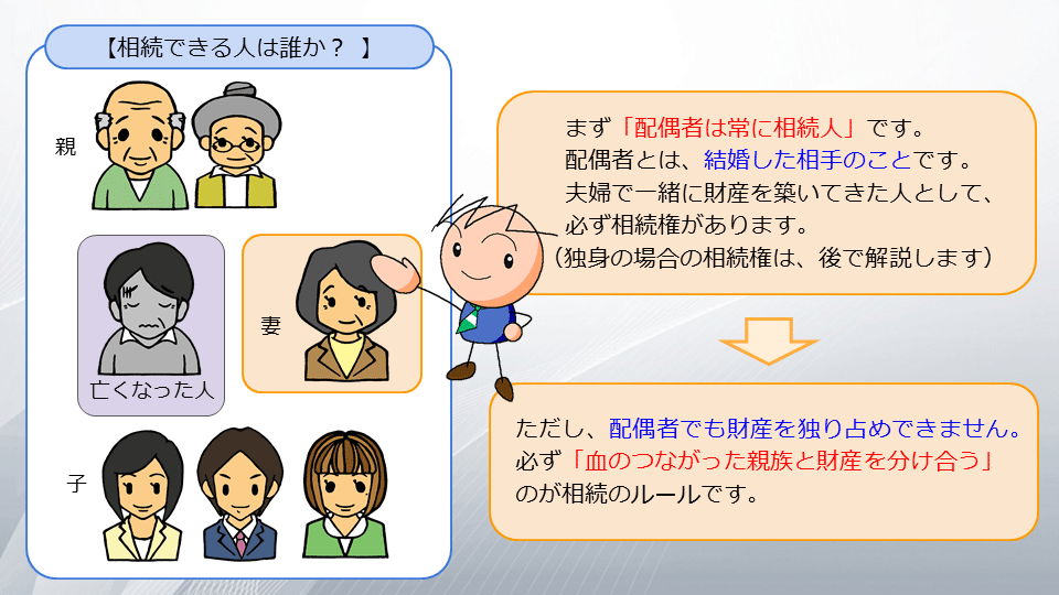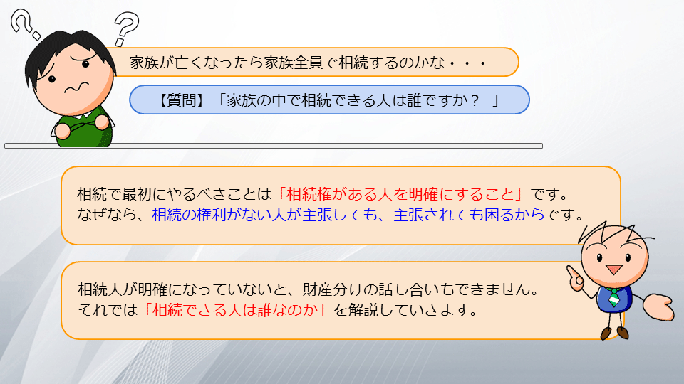 「家族全員が相続人ではありません」では「誰が相続人になるのか?」を解説します。